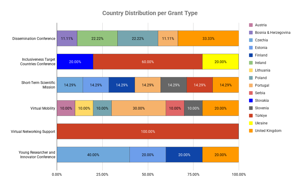 Inclusiveness Target Countries Conference grants were also highly concentrated, with Türkiye receiving 60%, and Slovakia and Ukraine each receiving 20%.