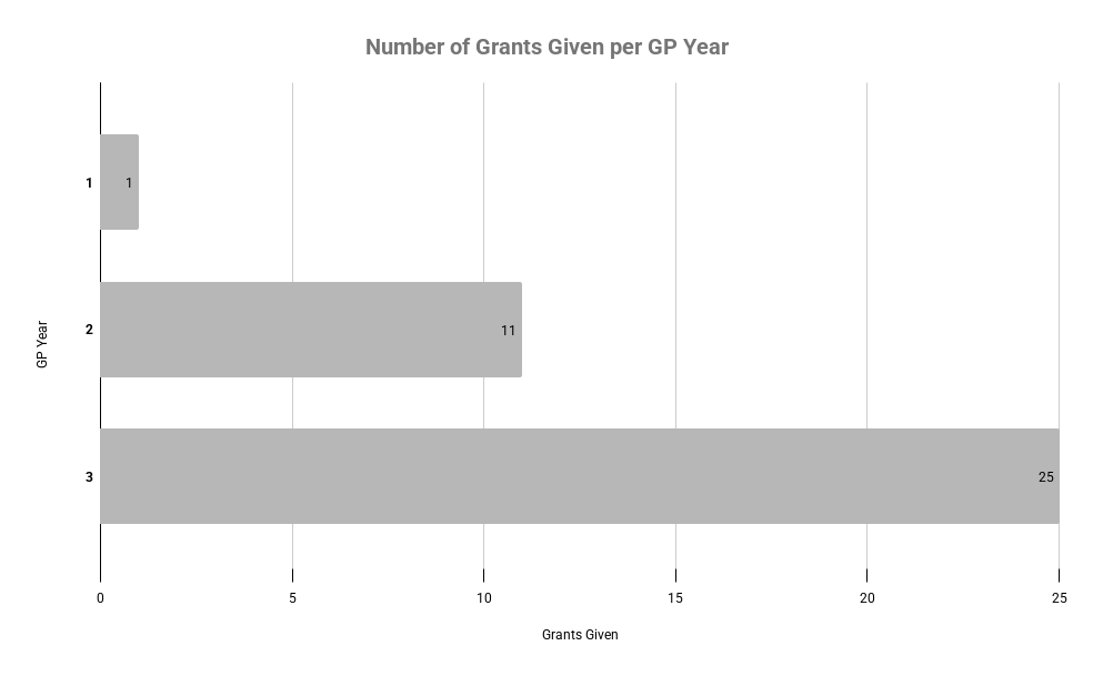 A bar chart titled “Grants Given by Grant Period (GP Year 1–3)” can be included here to visually illustrate this trajectory.